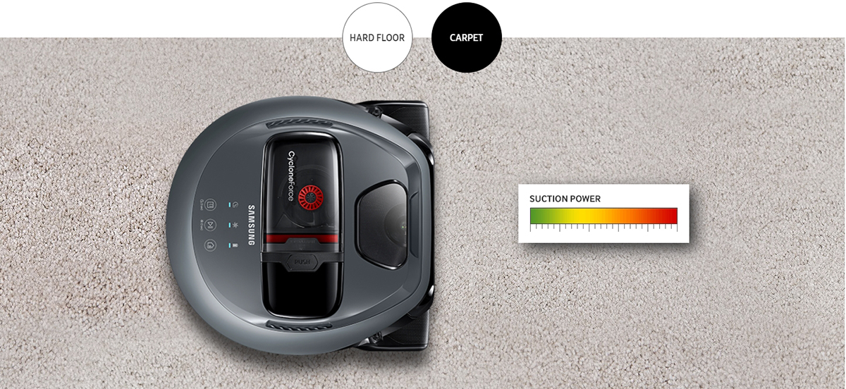 Các loại sàn khác nhau đòi hỏi sức hút khác nhau để đảm bảo chúng được làm sạch kỹ lưỡng. Để đáp ứng điều này, Samsung POWERbot có thể tự động phát hiện các loại bề mặt, cho dù đó là thảm hoặc sàn cứng, và tạo ra sức hút hiệu quả nhất. Khi POWERbot đi vào thảm hoặc từ thảm sang sàn cứng, nó sẽ tự động tạo ra sức hút phù hợp.