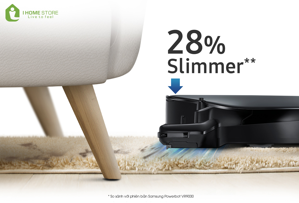Robot hút bụi Samsung POWERbot này được thiết kế với thân máy mỏng hơn mà không ảnh hưởng đến sức hút mạnh mẽ của nó. Robot chỉ cao 97mm, có kích thước mỏng hơn 28% so với robot thông thường, vì vậy robot có thể dễ dàng đi vào những khu vực khó tiếp cận như gầm ghế, gầm giường, gầm tủ, để đảm bảo ngôi nhà của bạn được làm sạch triệt để.