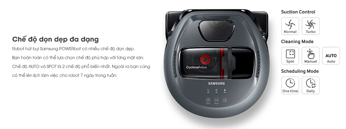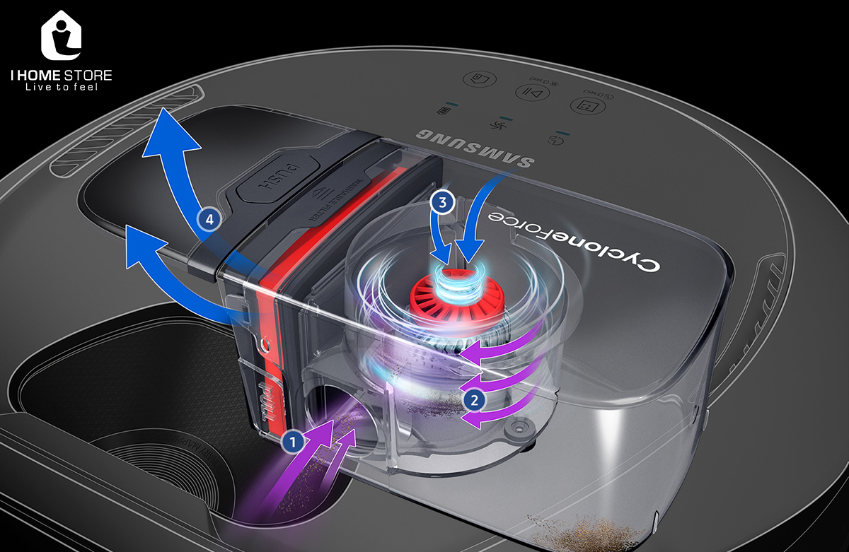 Công nghệ CycloneForce của máy hút bụi robot Samsung POWERbot này đảm bảo sức hút cực lâu trong một thời gian dài. Tạo ra một lực ly tâm mạnh mẽ lưu thông các hạt bụi thông qua buồng bên trong. Bụi bẩn và mảnh vỡ sau đó được lọc và đưa ra luồng khí trong lành. Kết quả là, nó giữ cho bộ lọc sạch lâu hơn và giúp ngăn ngừa tắc nghẽn, do đó, duy trì hiệu suất hút và làm sạch tối ưu.